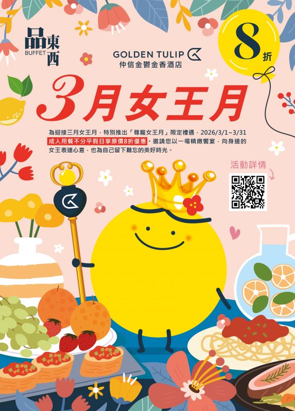 活動內容:為迎接三月女王月,特別推出「尊寵女王月」限定禮遇,活動期間成人用餐不分平假日享原價8折優惠。邀請您以一場精緻饗宴,向身邊的女王表達心意,也為自己留下難忘的美好時光。
