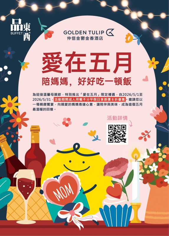 活動說明:為迎接溫馨母親節,特別推出「愛在五月」限定禮遇,自2026/5/1至2026/5/31,活動期間成人用餐不分平假日享原價8折優惠。邀請您以一場精緻饗宴,向親愛的媽媽表達心意,讓陪伴與美味,成為這個五月最溫暖的回憶。